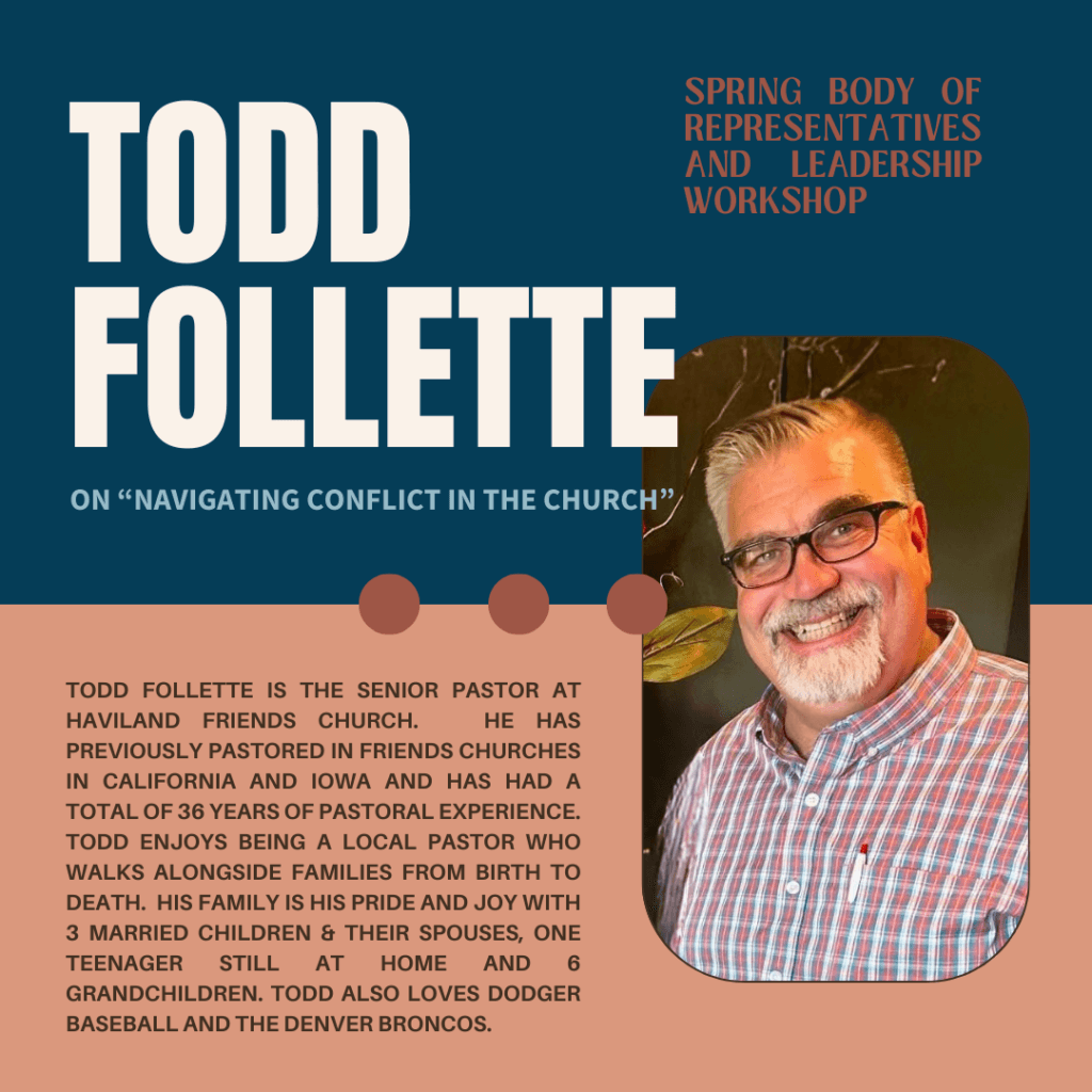 Our Annual Spring Body of Representatives and workshop will be held March 27-28. The workshop will be led by Todd Follette on “Navigating Conflict in the Church.” Registration will open January 29th. Details are being finalized, but the tentative plans are for the workshop to begin Friday evening with checkin at 6:30pm and resume Saturday morning at 9:00am. We will gather for business at 1:00pm, following a time of lunch and fellowship.
